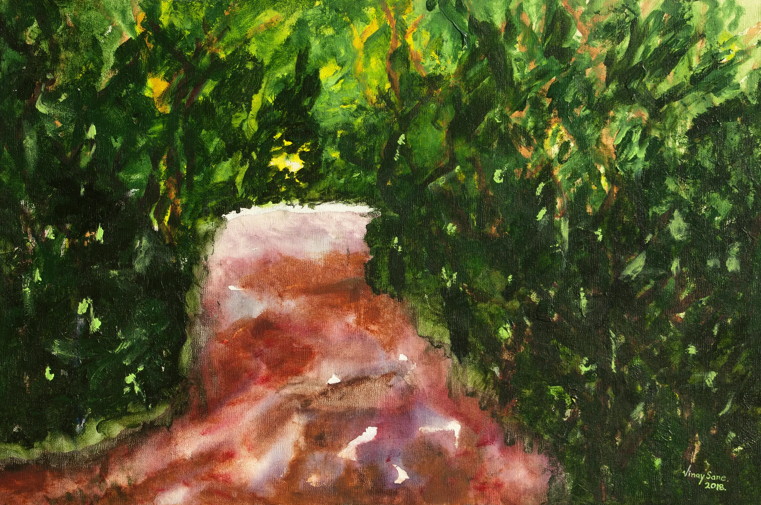 This painting is inspired by thick jungle from Mahabaleshwar. I was alone, walking towards King's chair. The thought of leopard lurking somewhere sent shivers down my spine. I was thinking about returning back. But, I persisted and reached the King's Chair... Enjoy being lost in jungle.